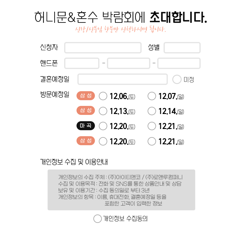 이름, 휴대전화, 결혼예정일 등을 포함한 고객이 입력한 정보